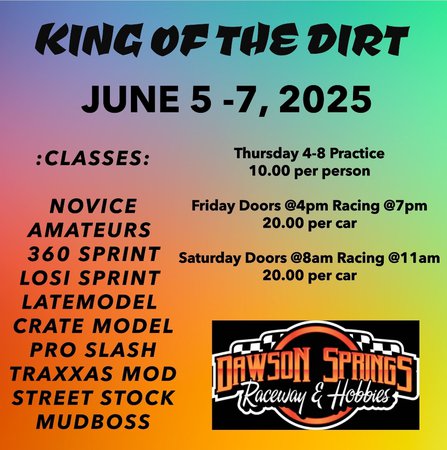 Dawson Springs Raceway is hosting the King of the Dirt event on June 5th through 7th. Check out the flyer and all the information here.
