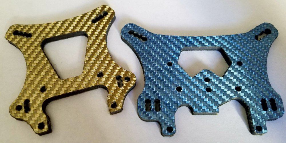 We have developed a Super Hybrid Kevlar Composite, includes Blue or Gold Carbon Fiber over Kevlar with a carbon fiber core. We have developed this shock tower to not only be awesome looking but be structurally stronger and more durable than any other shock tower material on the market using our special Carbon/Kevlar Composite..