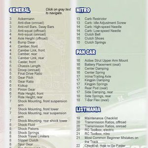 For those of us who haven't yet grasped the theory and physics of the tuning possibilities behind the many setup options, RC Cheat Sheets PDF with its 90+ cheat sheets and 70+ full-color photos will give you shortcuts to the information you need to make changes intelligently and quickly. Print it out and take it to the track!