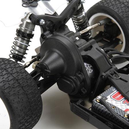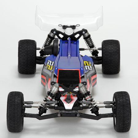 Revised Rear Suspension GeometryThe rear pivot is 2mm wider, giving the buggy significantly more grip and stability without losing any corner speed. The rear arm has also been revised with new shock mount locations and a slightly reduced gull wing effect. This, paired with the popular '0 hole' modification that is now designed into the rear shock tower, optimizes the jumping, landing and chassis roll dynamics of the rear end for the higher rear-weight bias.