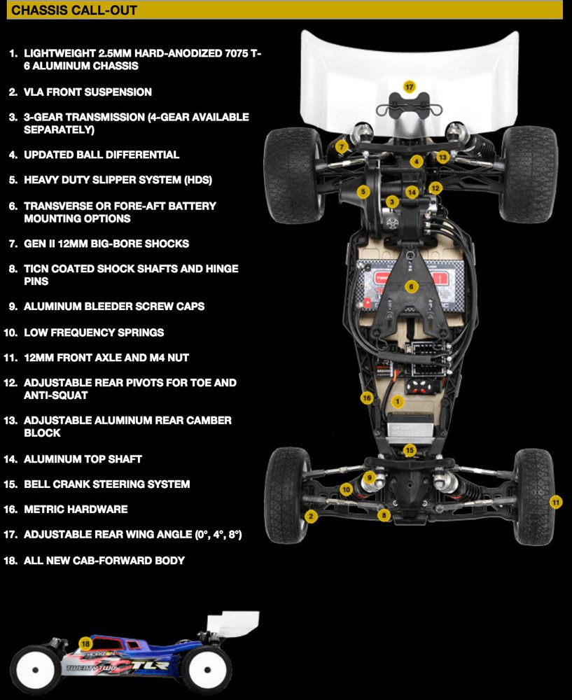 Option Parts IncludedMany of the parts included with this kit are popular upgrades that provide everything needed to build a pro-level buggy right out of the box. This includes milled, 7075-T6 aluminum parts like the top shaft, adjustable rear pivot mounts, motor plate, rear camber block, shock bleeder caps and ball stud spacers throughout. Machined shock pistons and bushings, Ti-CN coated shock shafts and hinge pins, C3 spec hub bearings, low frequency springs and the heavy duty slipper system are also included.