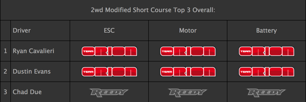 Team Orion Factory Driver Ryan Cavalieri would complete the perfect sweep of TQ's by taking the overall TQ in the 2wd Modified Short Course class. The A-Main Event was set for one single 7-Minute race. Cavalieri would lead every lap and take the Win by a considerable margin being the only driver to get by for the 27th lap! This would complete the perfect sweep of TQ'ing & Winning all 3 Modified Classes he raced! Team Orion's Dustin Evans would finish 2nd overall and AE's Chad Due would round out the podium in 3rd.